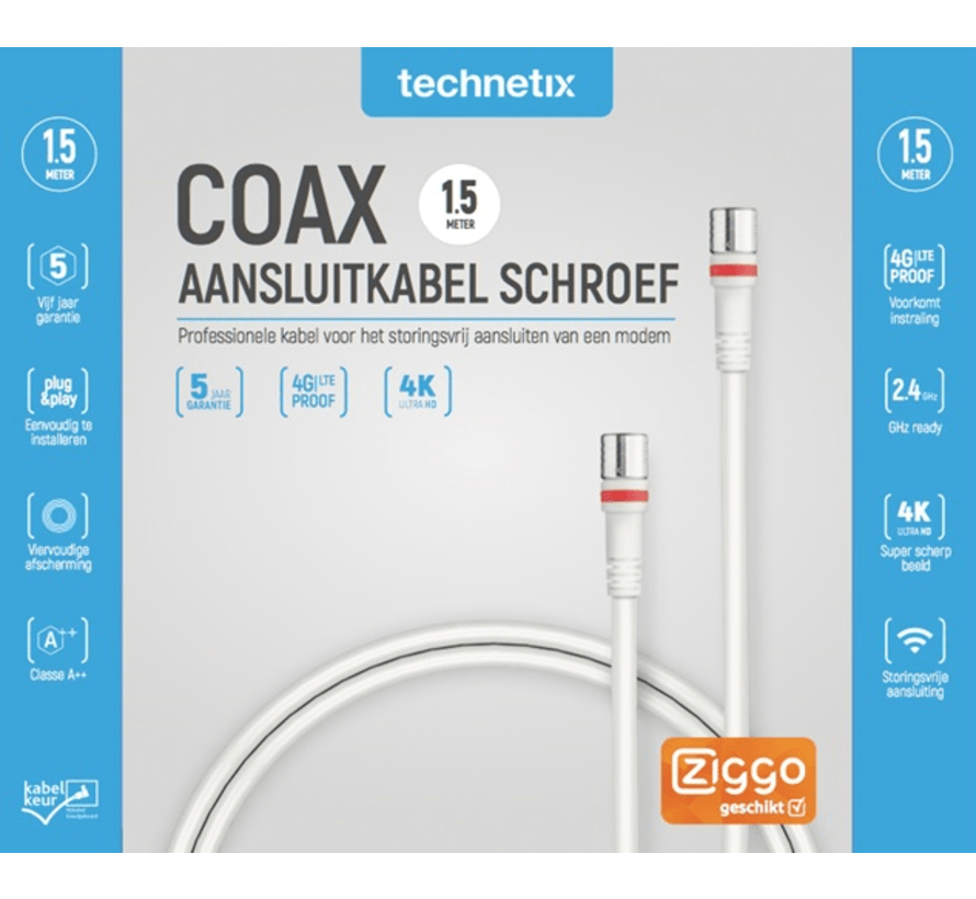 Met de Technetix modemkabel RLA++30.1.5RT sluit u een modem, mediabox, tv of radio aan op een wandcontactdoos, versterker of splitter. De kabel is aan beide kanten voorzien van male F-connectoren en is Ziggo-gecertificeerd.